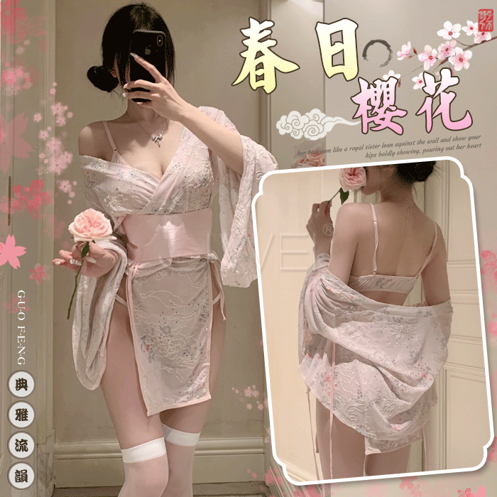春日櫻花.風情開襟露胸微透日式和服套裝-粉色【外套+胸罩+T褲+腰封+分片裙*2】