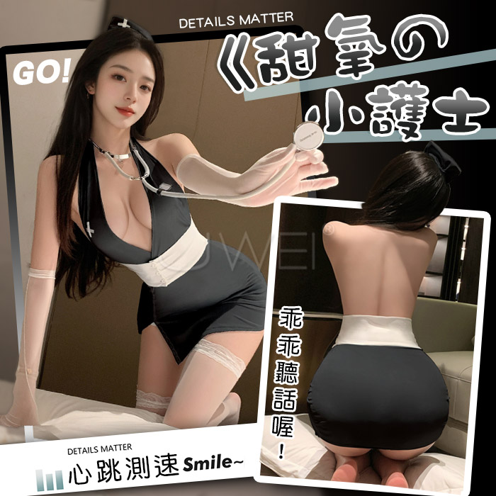 甜氧小護士.私人護士深V露溝微開衩包臀連身裙-黑色【帽子+洋裝+T褲】
