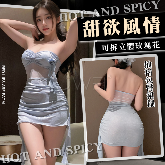 甜欲風情.性感抹胸可拆卸玫瑰花胸針點綴抽褶包臀連身裙-藍色【連身裙+可拆式胸針+T褲】