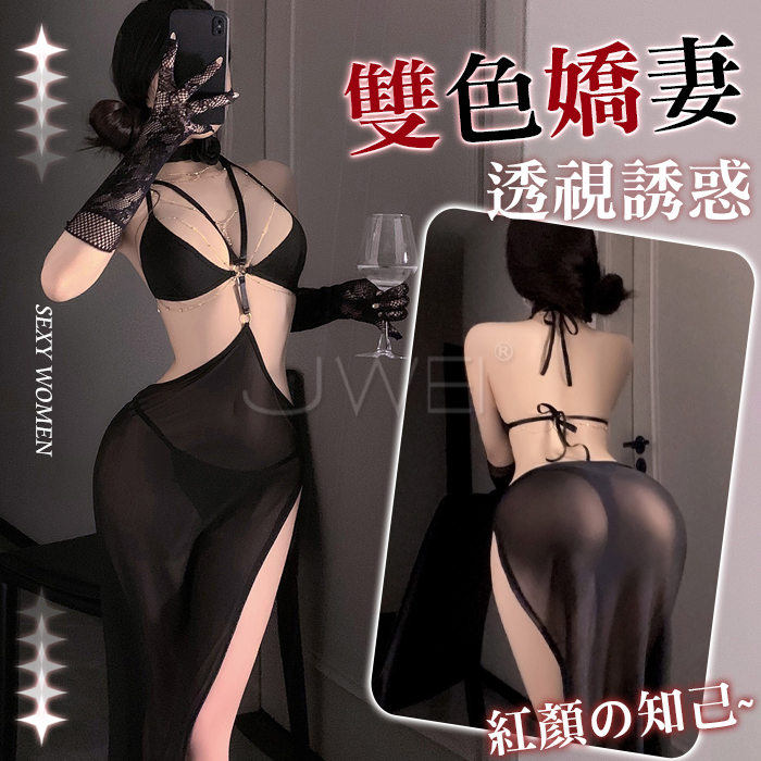 雙色嬌妻.迷迭花樣掛脖頸環美背側高衩網紗睡裙-黑【頸環+連身裙+內褲】