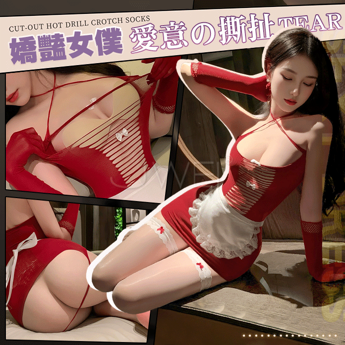 嬌俏女僕.火辣條紋露胸可撕網衣女樸套裝-酒紅【連身網衣+圍裙+手套*2】