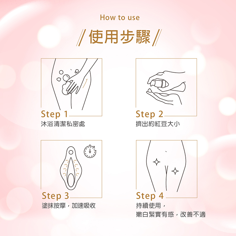 用法:建議沐浴清潔後,以按摩方式取1ml 均勻塗抹於外陰部,並可視個人情形,斟酌使用劑量。早晚各塗抹一次效果更佳。