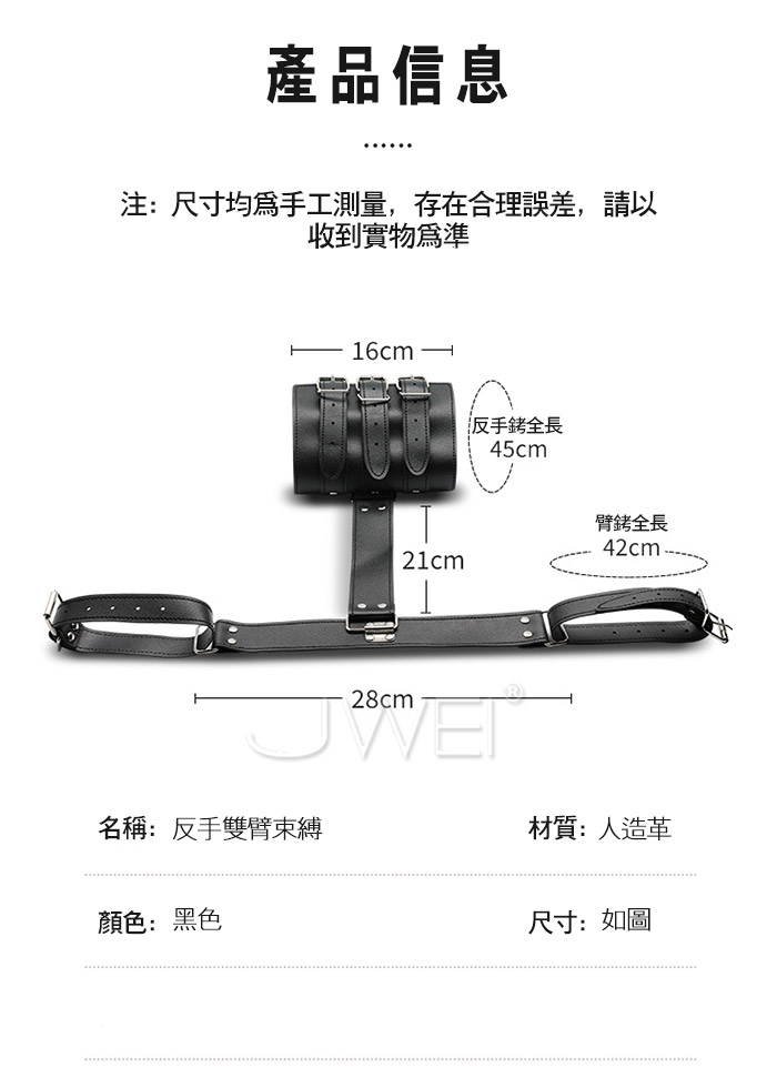 反手雙臂束縛 雙臂綑綁 束縛力更強! 補助調教利器,享受被包裹、被束縛、緊縛雙臂的樂趣.... 細節彰顯品質,柔軟皮革不傷皮膚,優選五金材質,久玩不易壞。 產品規格 ■尺寸:大小詳如圖片標示 ■材質:人造皮革 ■特色:情趣調情 ■注意事項:SM道具請以安全、清醒、非強迫為使用原則, 使用前請先徵得對方 的同意;使用時如有任何不適,請立即停止使用。