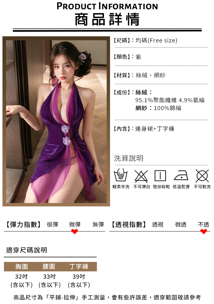 情趣睡衣!迷情幻紫絲絨拚紗斜開襟綁脖露背連身裙兩件組