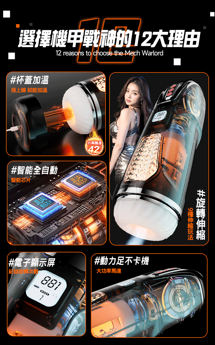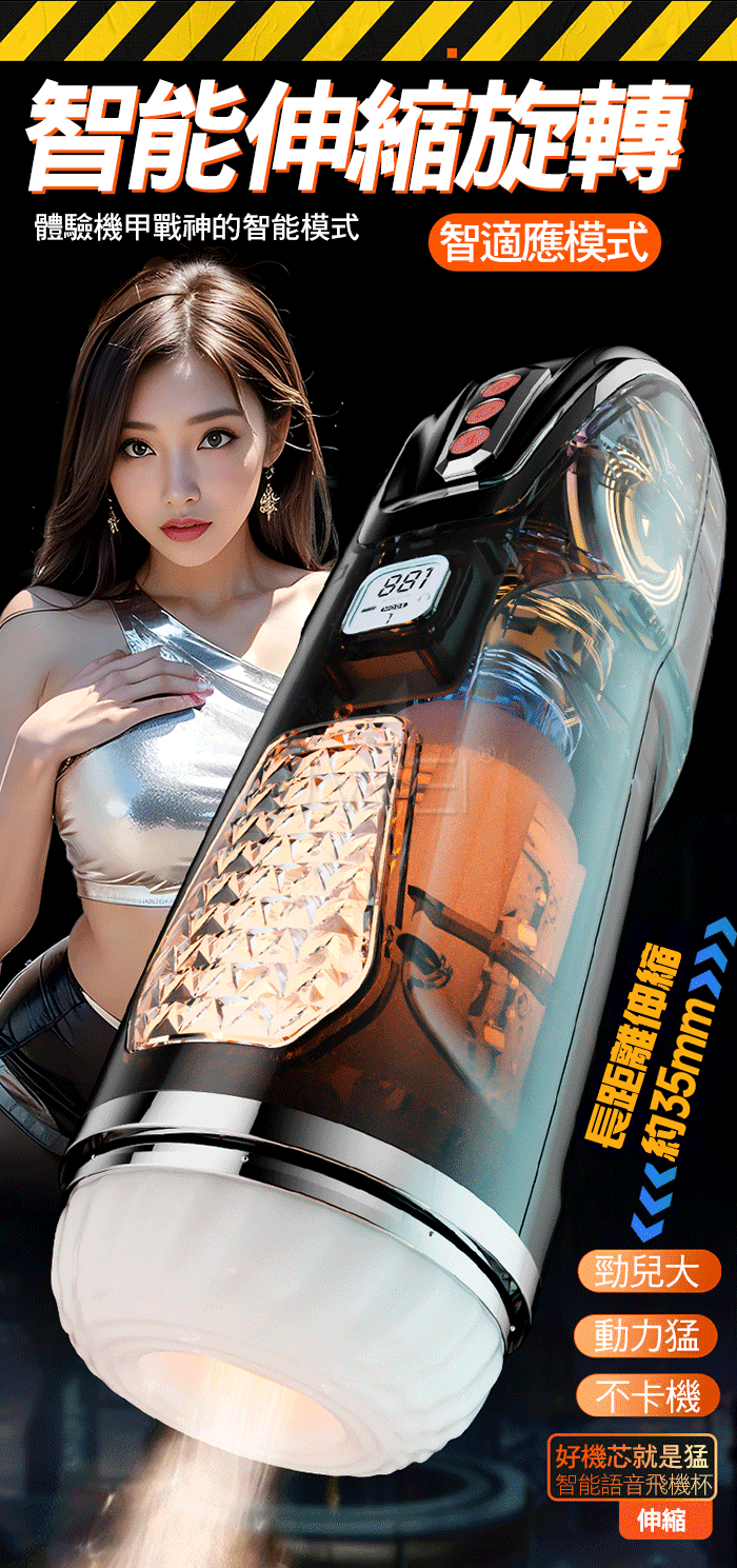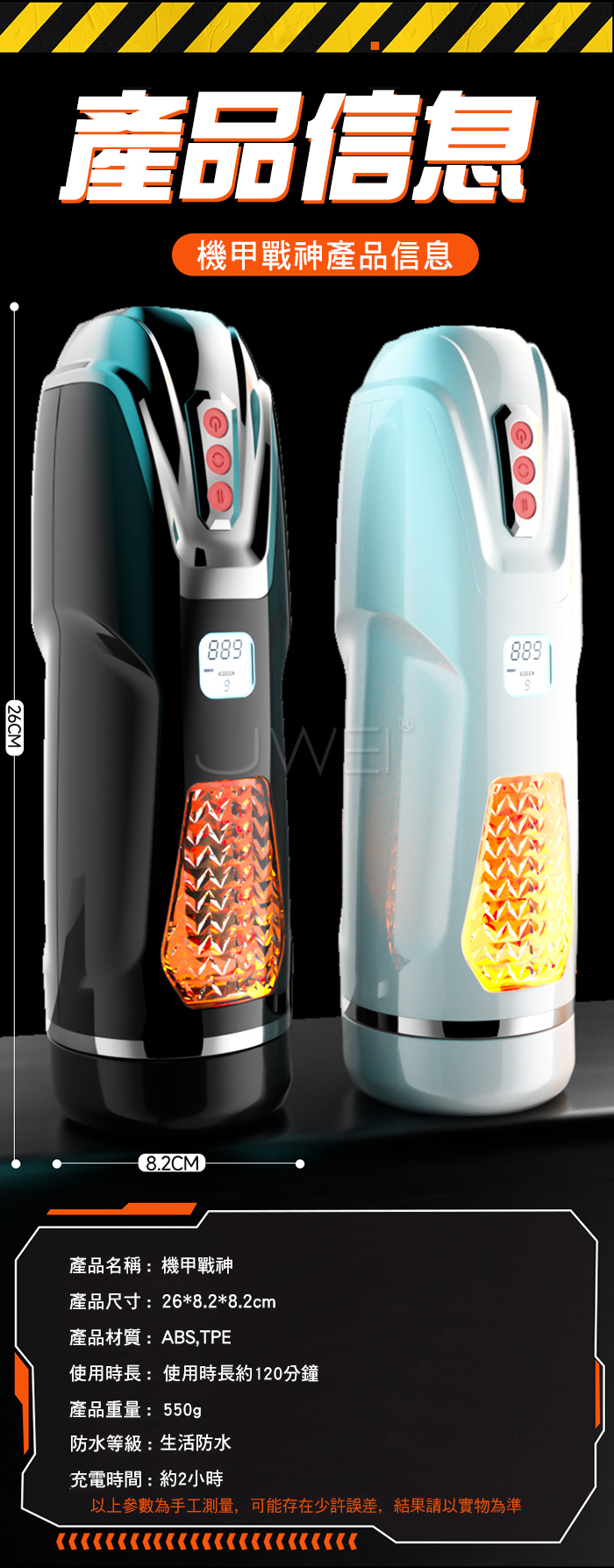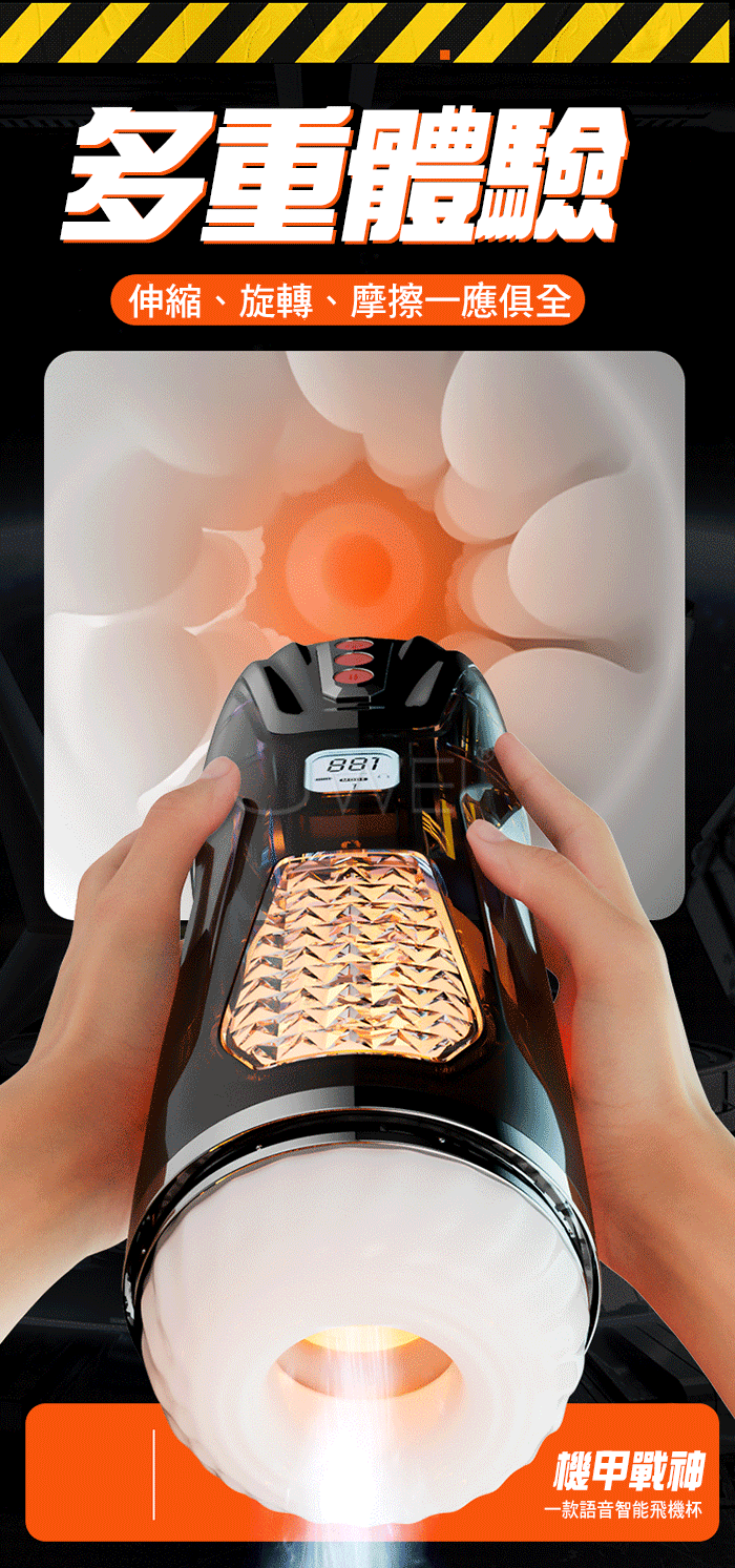 智能伸縮旋轉,體驗機甲戰神的智能模式 長距離伸縮約35mm,伸縮旋轉摩擦一應俱全,多重體驗 中英韓日,四國美女魅惑發聲,滿足你的觸覺聽覺視覺 42℃杯蓋加溫,全新設計更方便,加溫更快!! 產品規格 ■尺寸:大小詳如圖片標示 ■材質:TPE+ABS ■功能:9頻伸縮震動 ■供電:USB充電