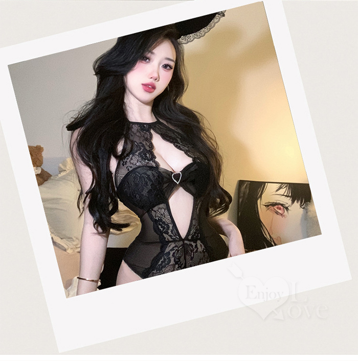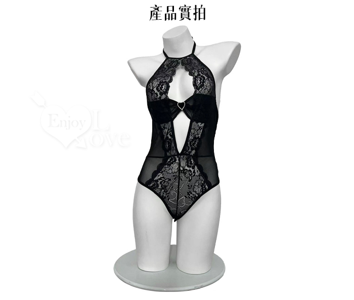 ►您現在的位置:首頁>狂野連身衣!綁脖蕾絲薄紗勾勒花紋愛心點綴可開襠連身衣兩件組