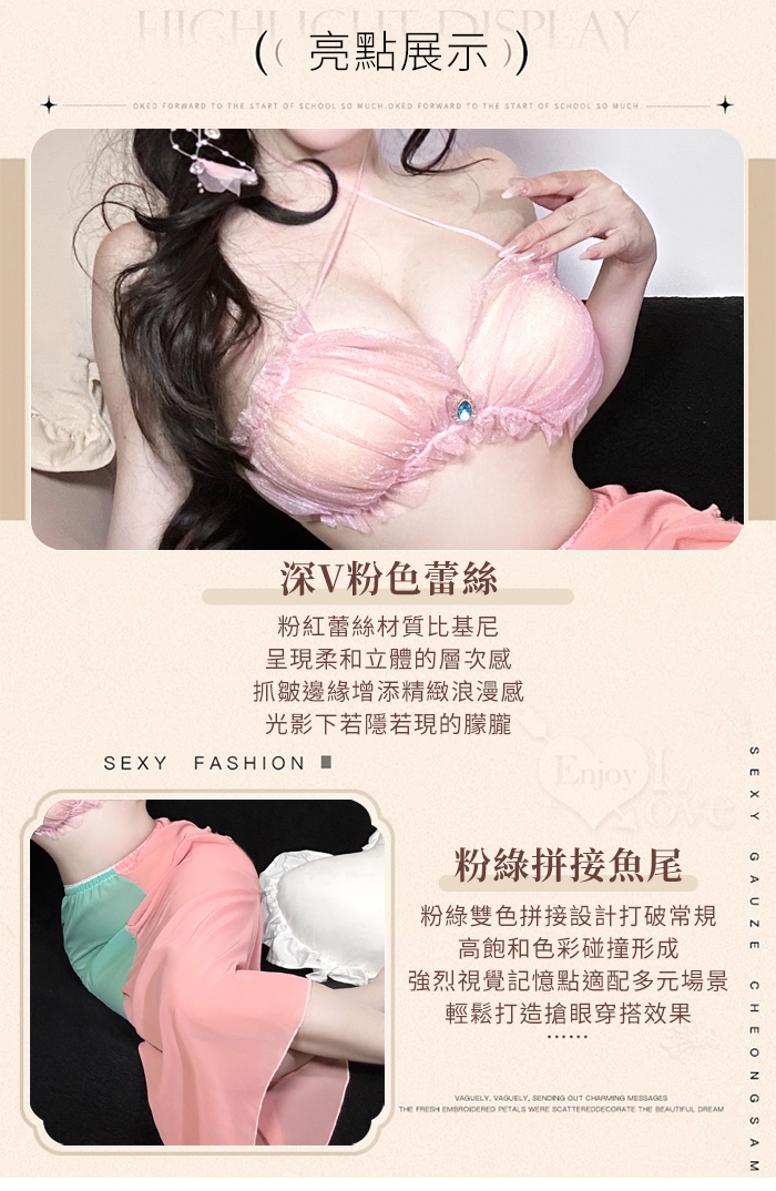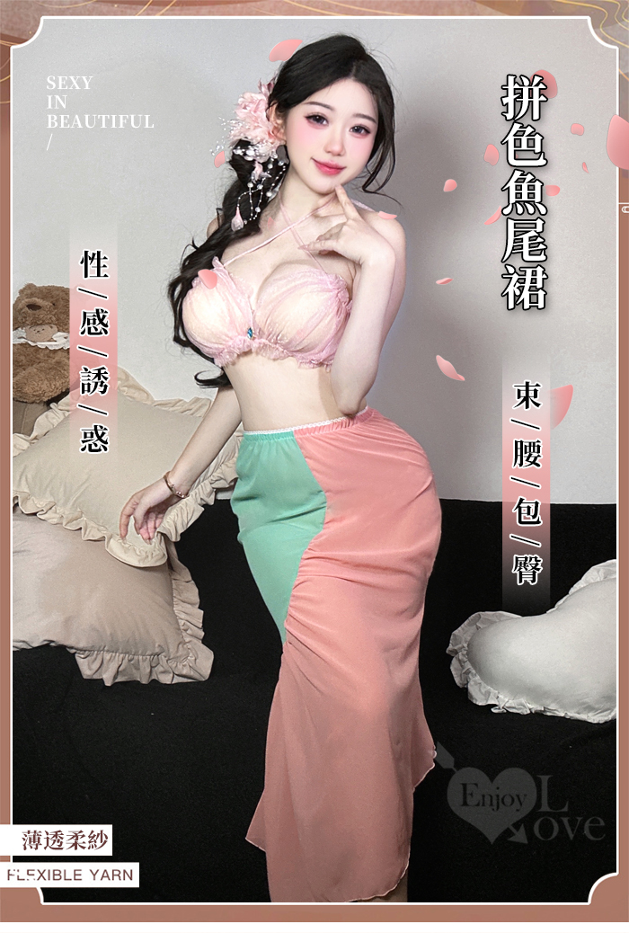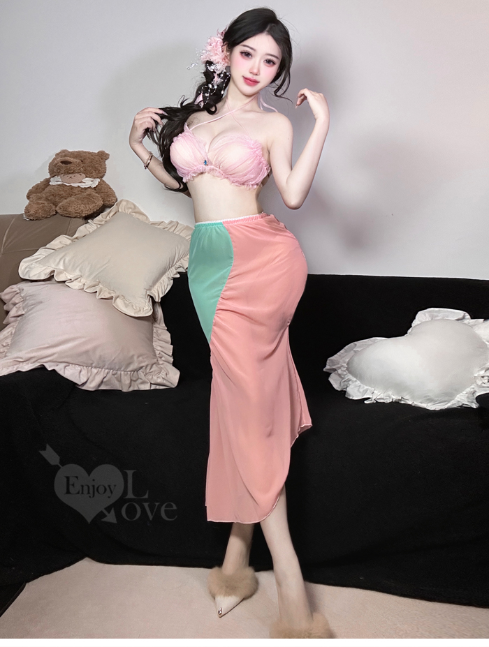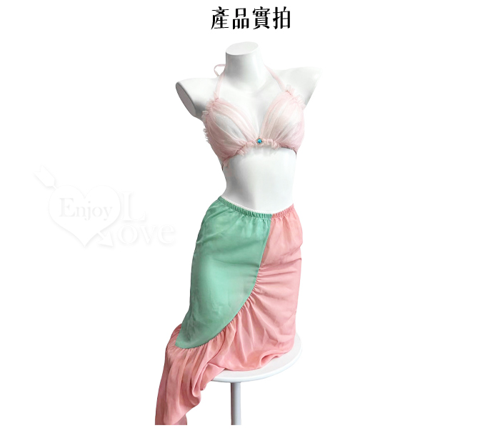 美人魚角色扮演服!亮絲薄紗貝殼比基尼粉綠拼接魚尾裙三件組