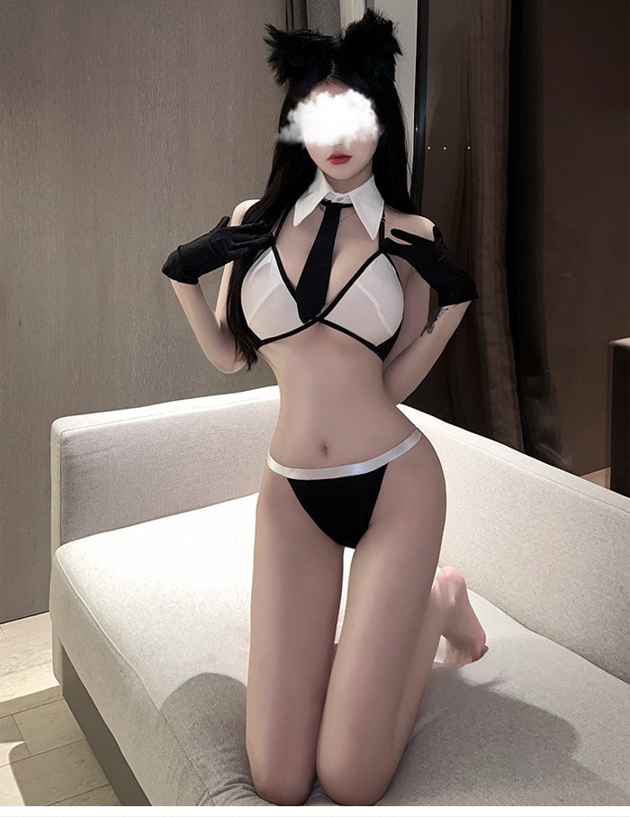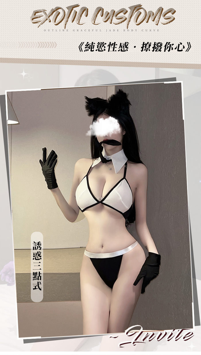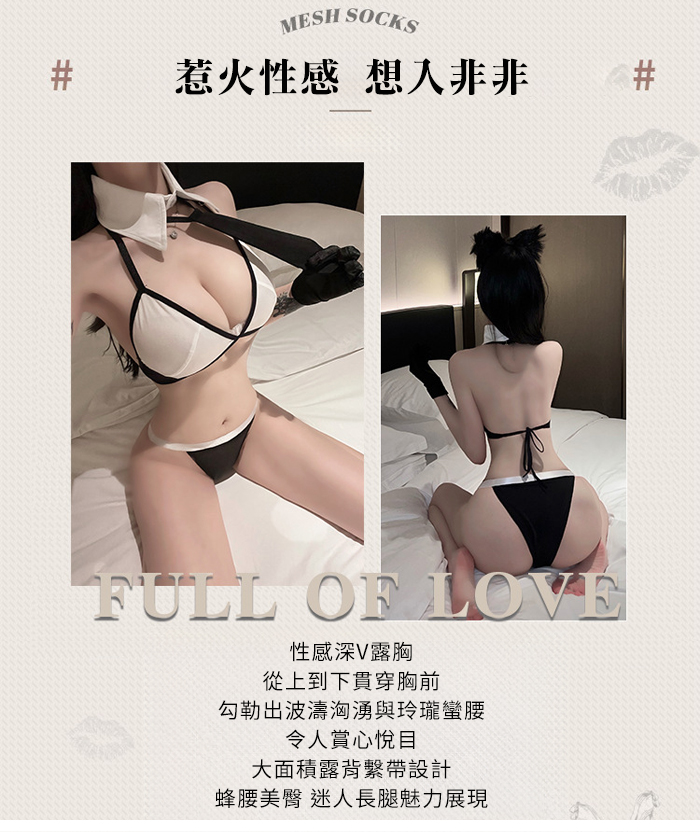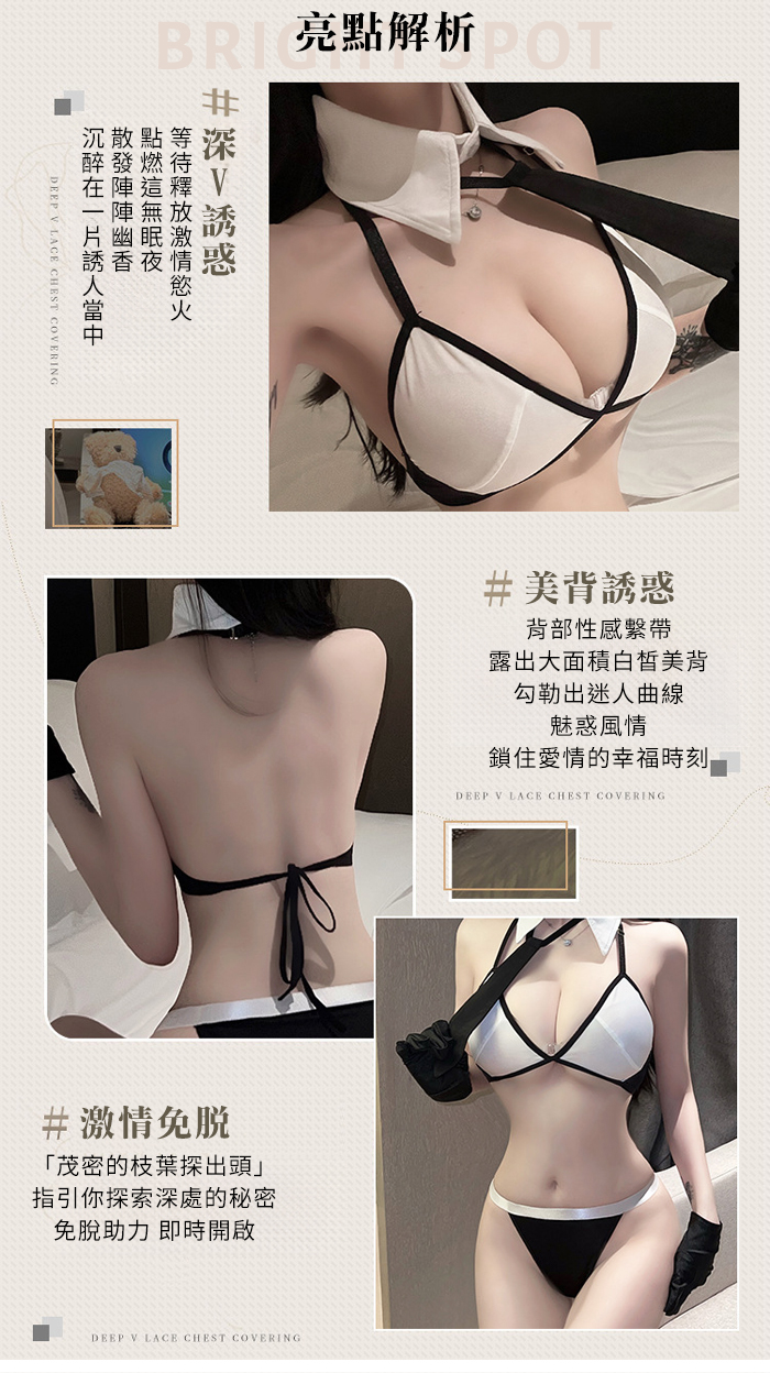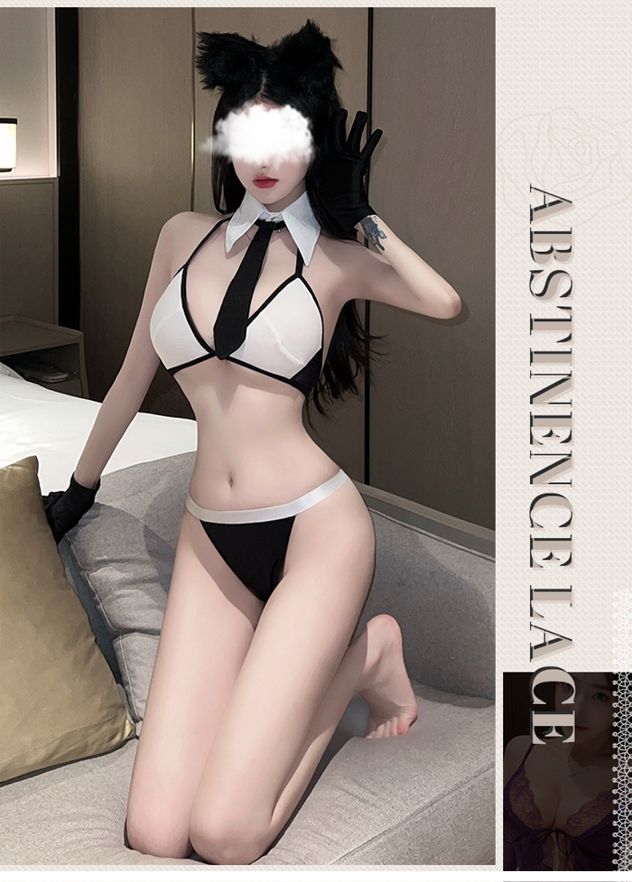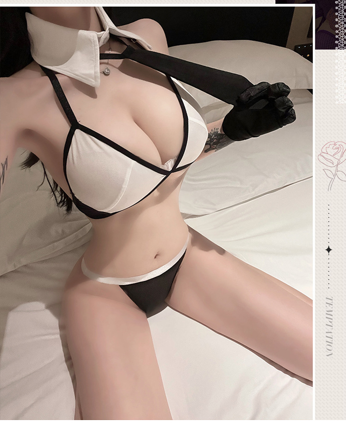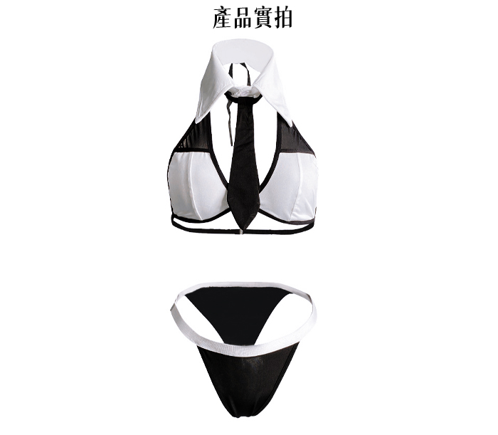 情趣比基尼!帥氣領帶點綴黑白撞色綁脖三點式比基尼四件式套裝