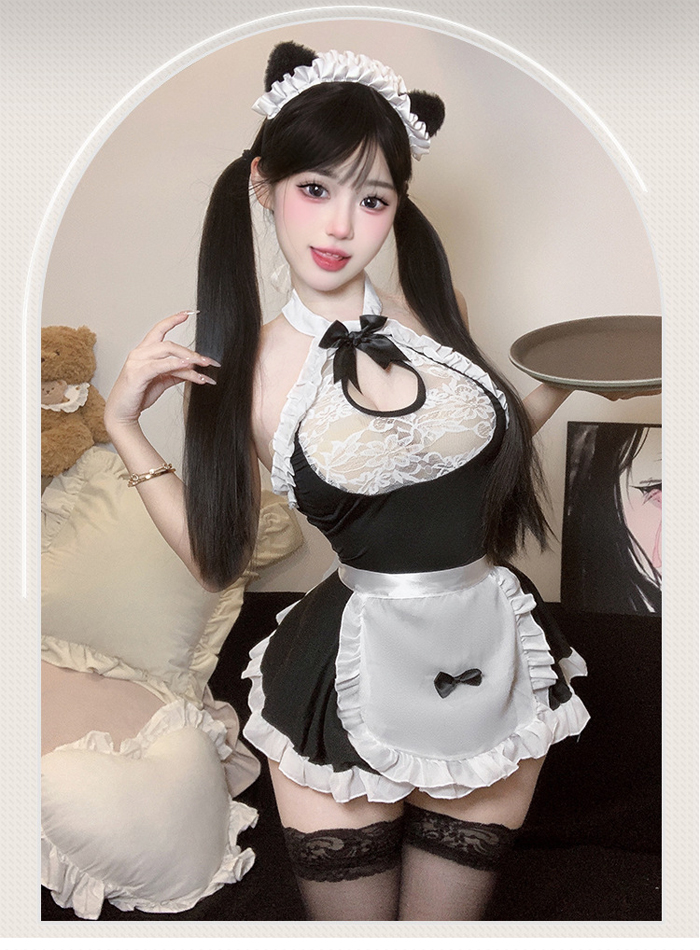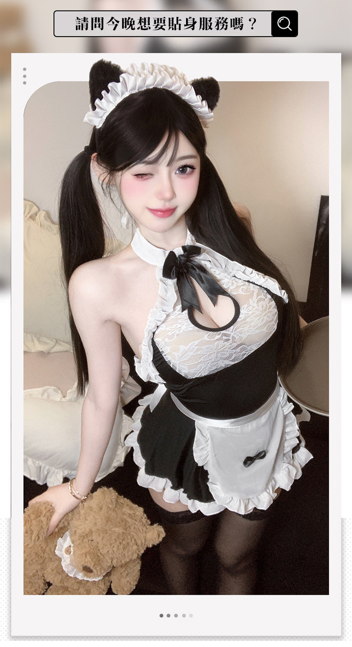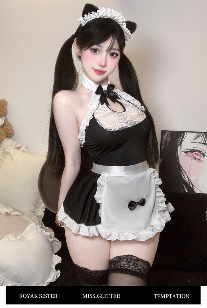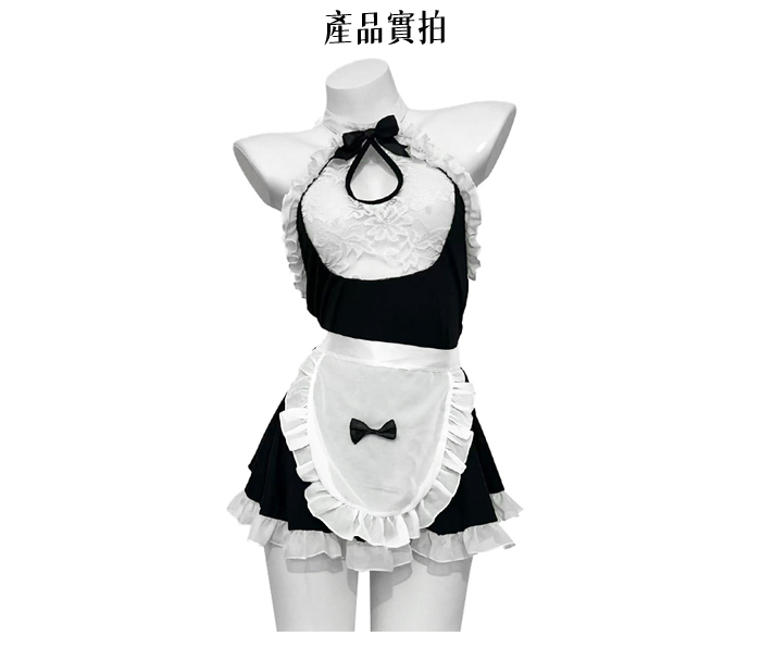 女僕角色扮演服!荷葉邊蕾絲水滴透胸連身裙含木耳邊蝴蝶結圍裙四件式套裝