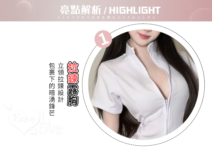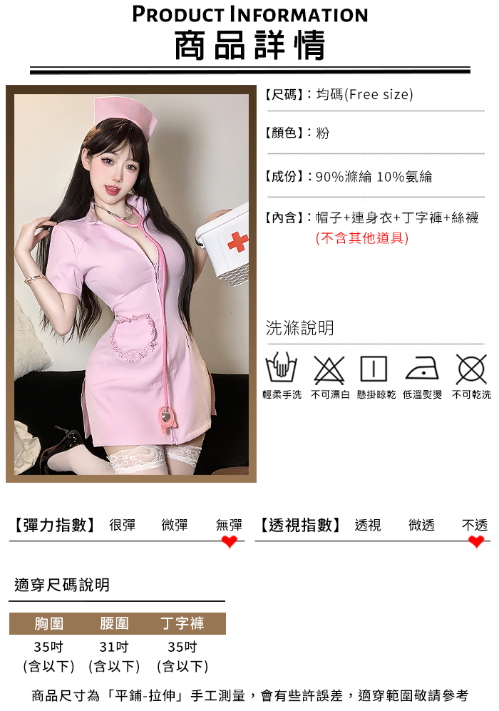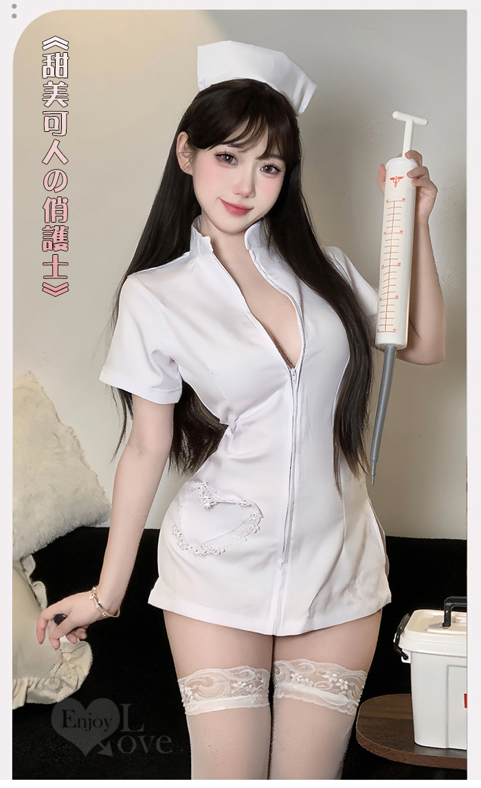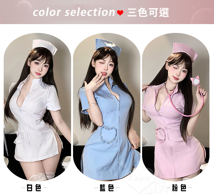 護士角色扮演服!拉鍊露胸V字誘惑愛心點綴開衩連身裙四件式套裝﹝粉﹞