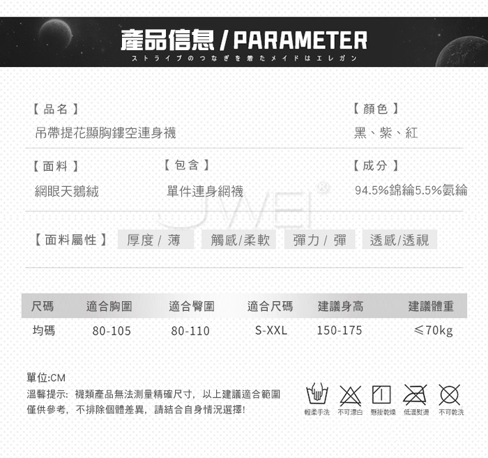 ■內容物:單件連身網襪 ■適穿尺寸:FREESIZE ■彈性:彈 ■未撐開平量尺寸正負誤差1~2cm,1吋=2.54cm ■注意事項:基於保障消費者個人衛生,此貼身衣物恕不接受退換貨。 (如為商品本身暇疵,接受七日內換貨,請勿試穿,謝謝您)