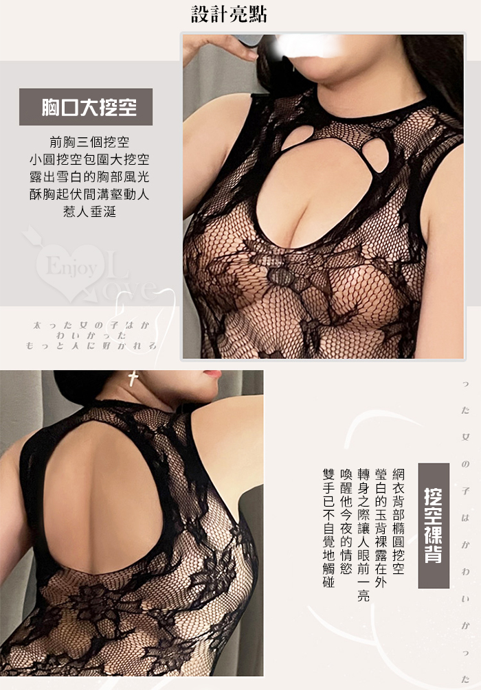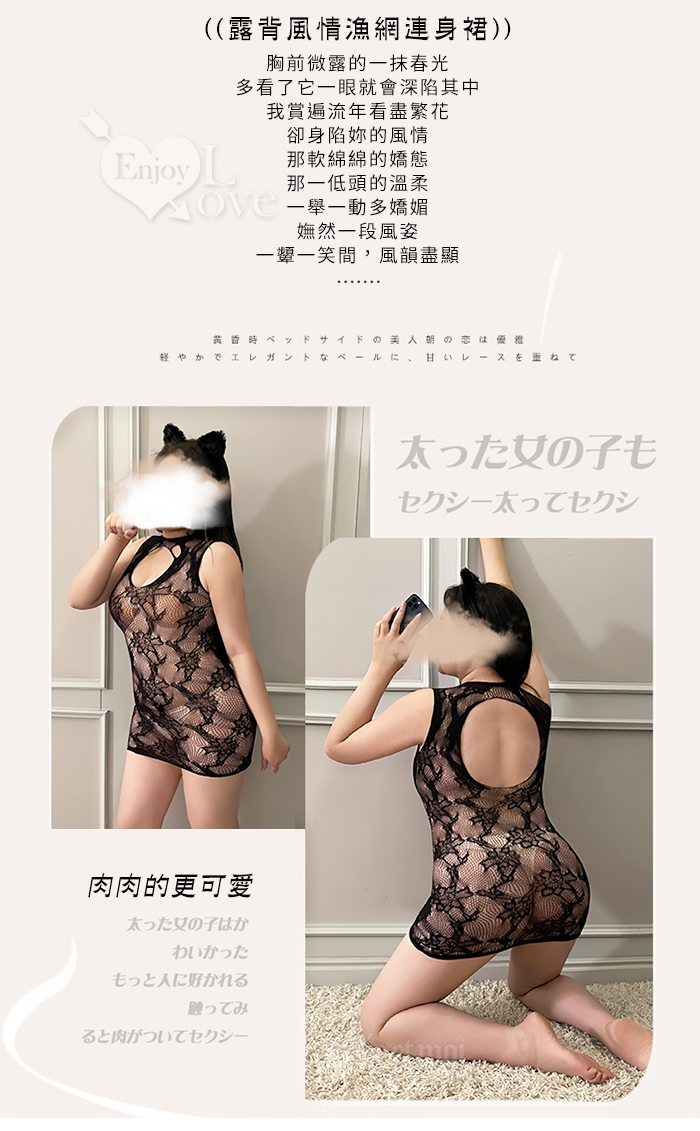 【棉花糖女孩】大尺碼極性貓裝!裸肌花卉蕾絲露背風情漁網連身裙