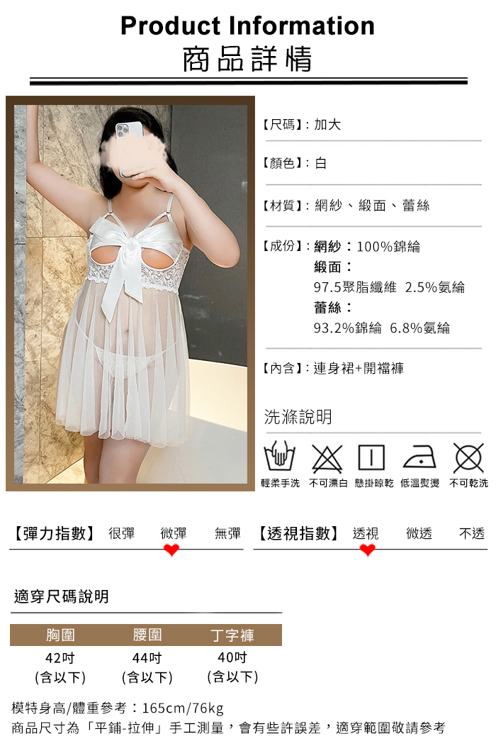 【棉花糖女孩】大尺碼情趣睡衣!心機挖空鋼圈托乳絲帶裹胸後開衩柔紗裙兩件組﹝白﹞