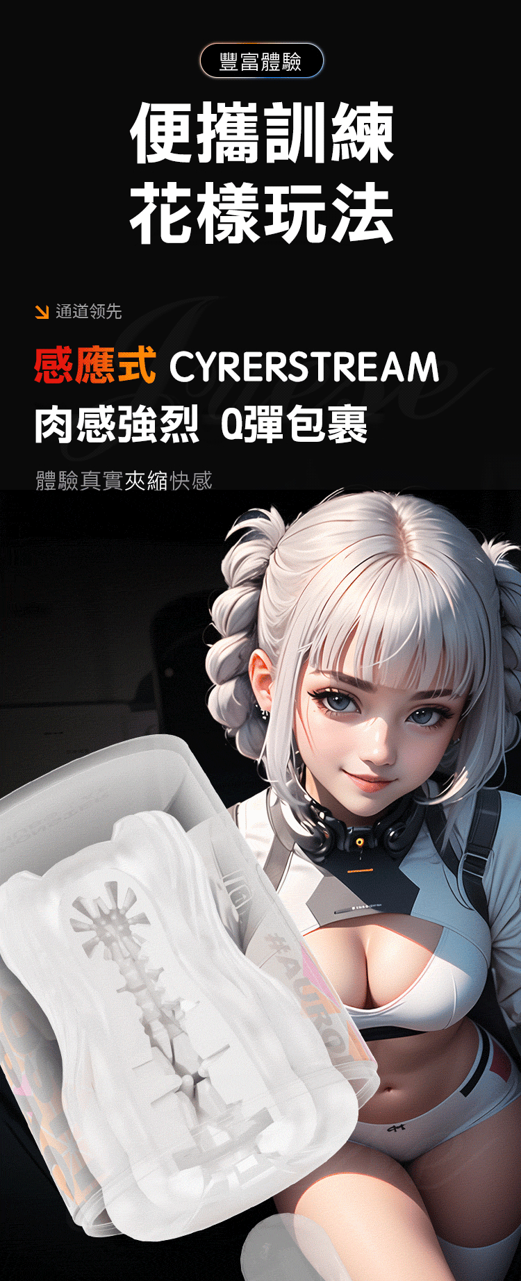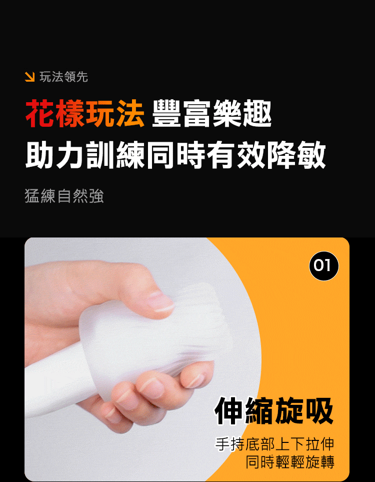 便攜訓練,花樣玩法,肉感強烈Q彈包裹,體驗真實夾縮快感。花樣玩法豐富樂趣,助力訓練同時有效降敏,猛練自然強。