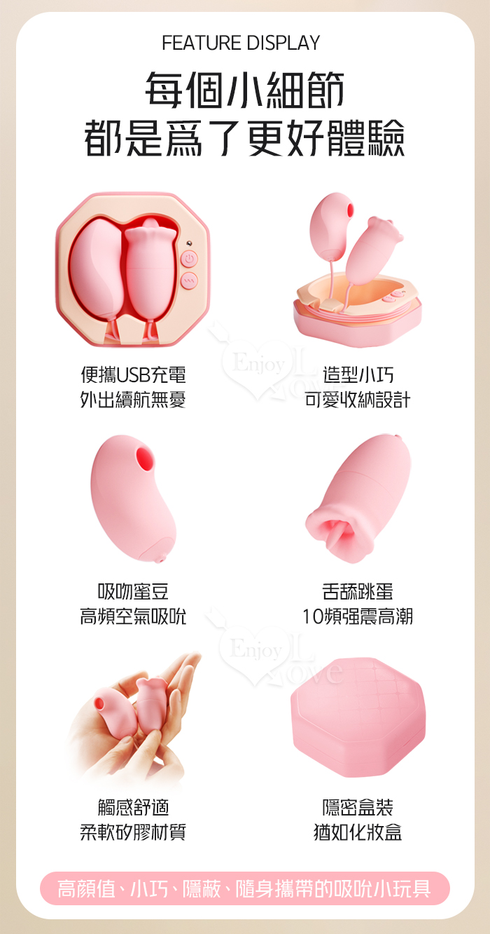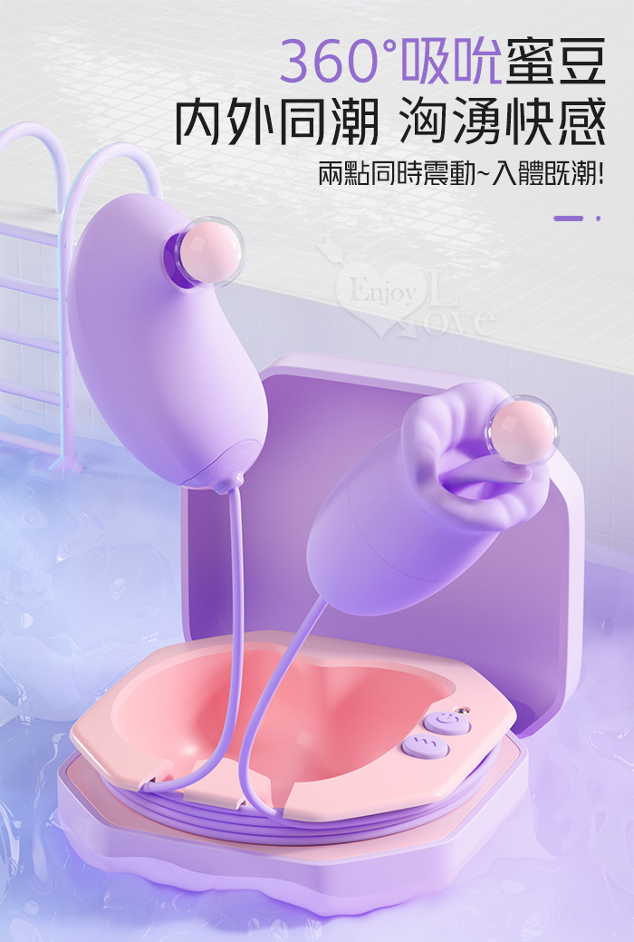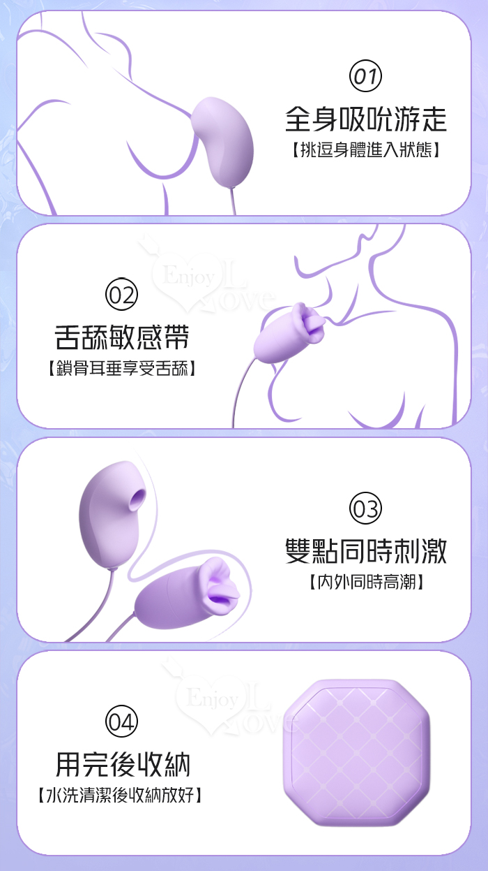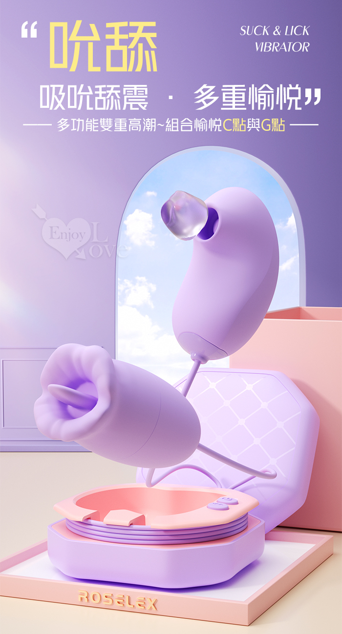 ROSELEX 勞樂斯 ‧ 吻喜 10X10吸震遊走+舌撩陰乳 隱密盒裝舔吸組合雙蛋﹝內外同享+可獨立控制+USB充電﹞紫