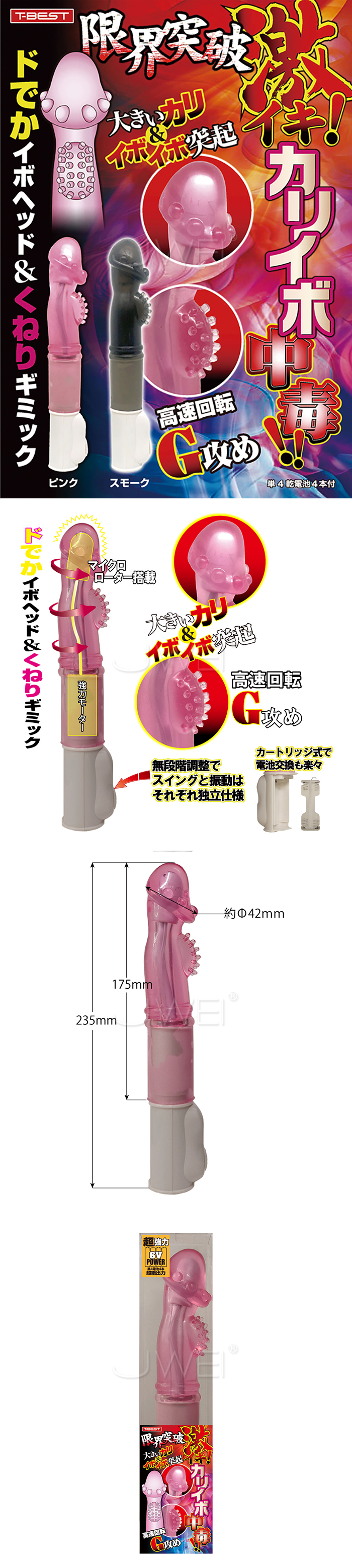 日本原裝進口T-Best.限界突破 激イキ! G點大顆粒突起旋轉按摩棒【黑色】