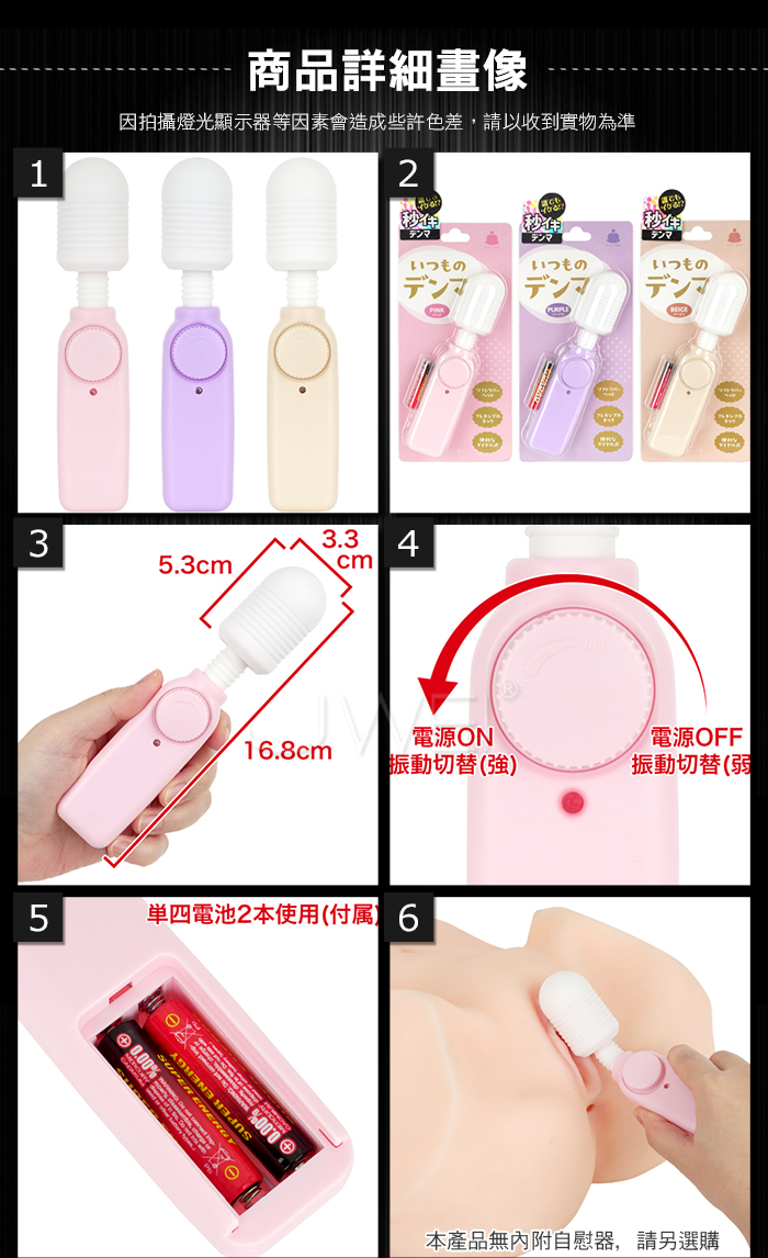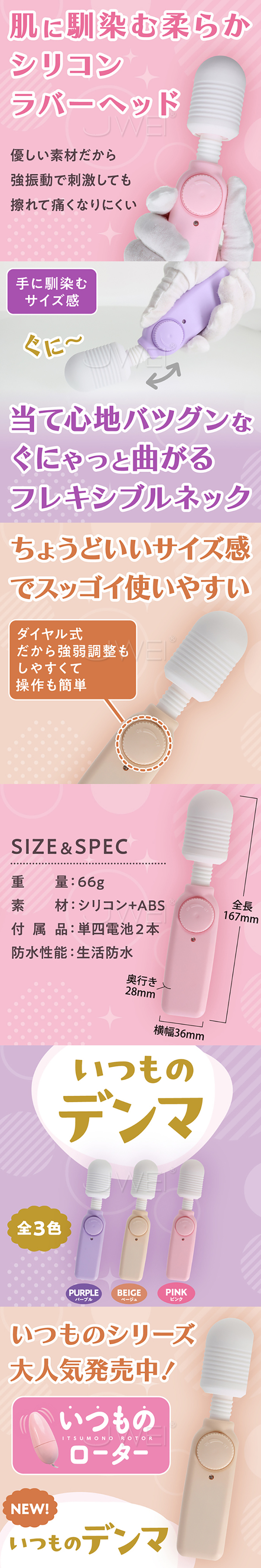 【単四電池×2本】 お手軽さと使い心地を重視したとってもカジュアルなデザインのミドルサイズデンマ登場! 触り心地抜群のシリコンラバーヘッドに優しい当て心地のフレキシブルネックはもちろん、 使いやすいダイヤル式スイッチ仕様。 高品質モーターを採用して丁度良い振動も魅力です。 軽量&持ちやすい形状だから疲れにくく、楽しめます。 電マがよりお手軽に楽しめるローターライクバイブレーター。 ■パッケージサイズ:H214×W100×D32mm ■本体サイズ:H167×W36×D28mm