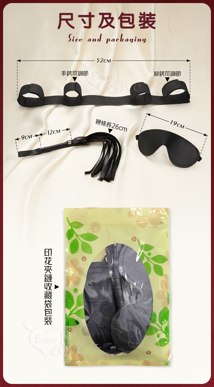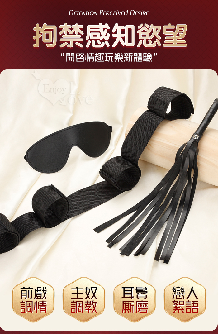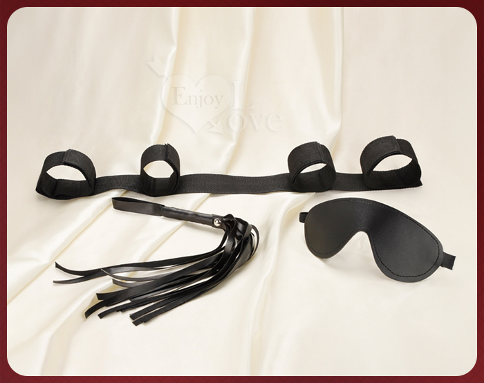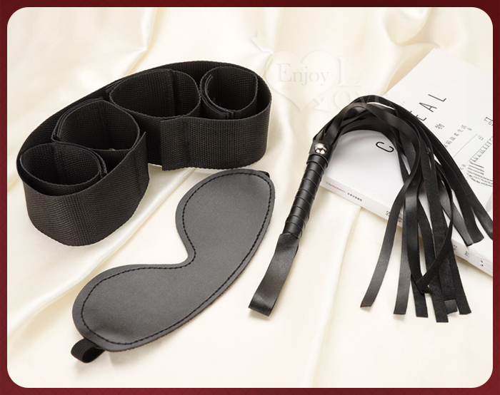 SM性愛調教 ‧ 束缚雙手腳銬+調情眼罩+調教小散鞭 遊戲三件組(簡易版)