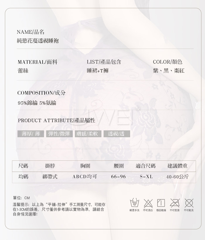 ■內容物:睡裙+T褲 ■適穿尺寸:FREESIZE ■彈性:微彈 ■未撐開平量尺寸正負誤差1~2cm,1吋=2.54cm ■注意事項:基於保障消費者個人衛生,此貼身衣物恕不接受退換貨。 (如為商品本身暇疵,接受七日內換貨,請勿試穿,謝謝您)