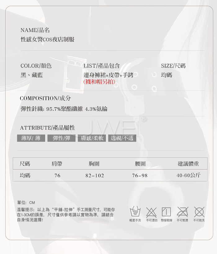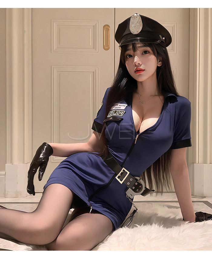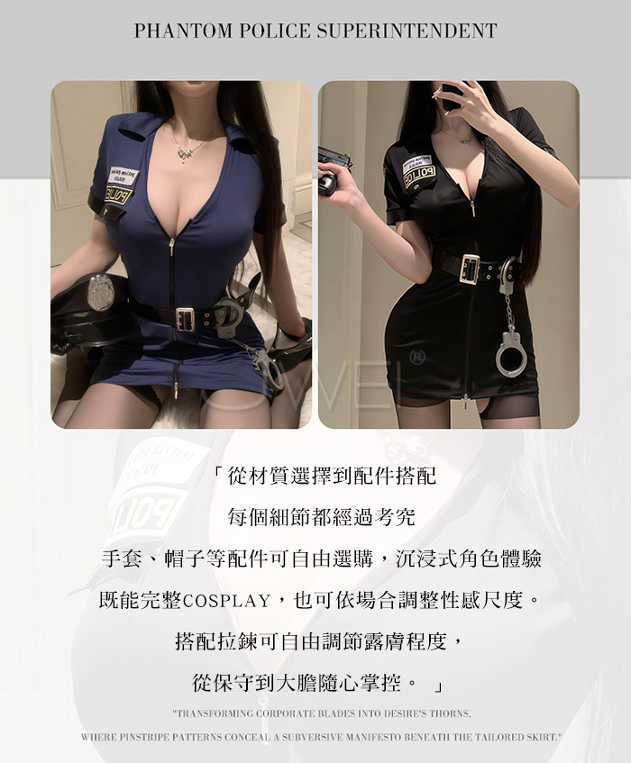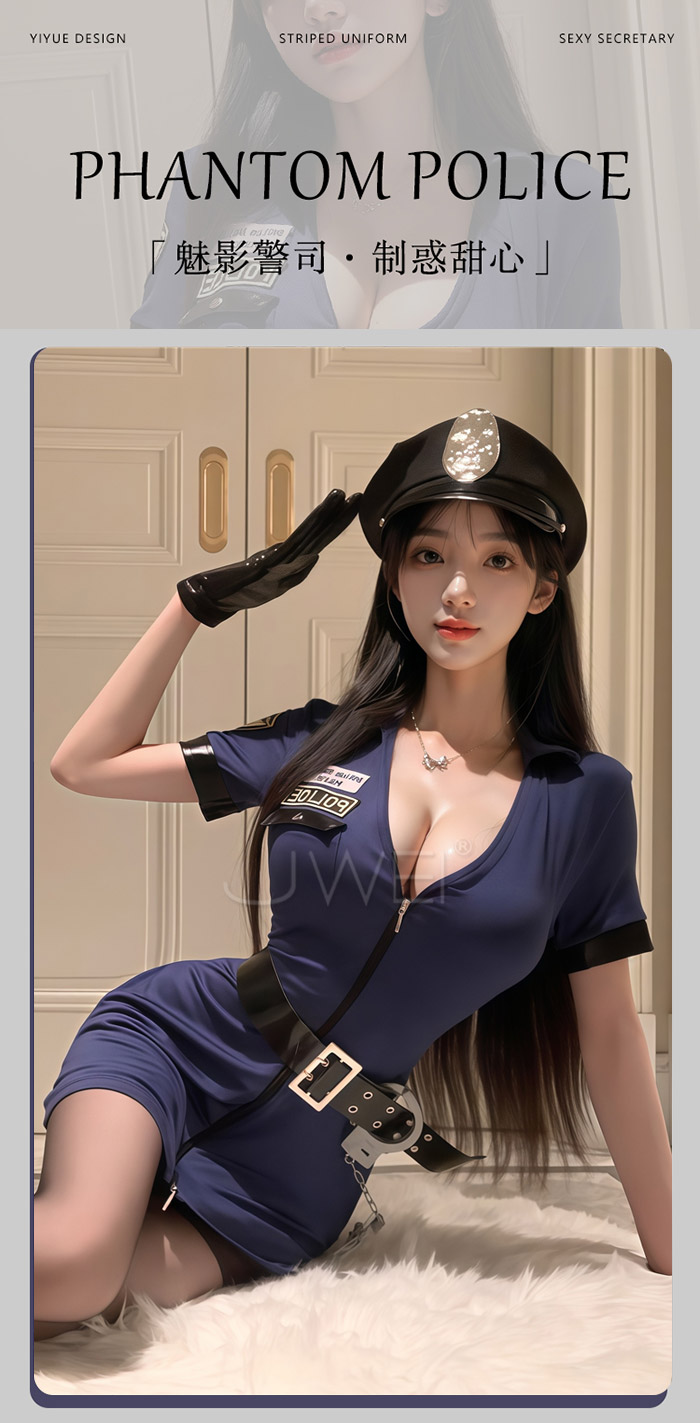 首頁>魅影警司.制惑拉鍊調節開胸性感貼身包臀女警套裝-藏藍色【連身褲裙+皮帶+手銬】