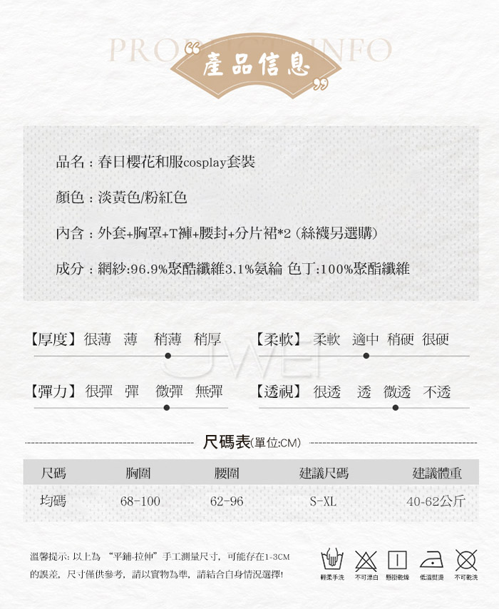 ■內容物:外套+胸罩+T褲+腰封+分片裙*2 ■適穿尺寸:FREESIZE ■彈性:微彈 ■未撐開平量尺寸正負誤差1~2cm,1吋=2.54cm ■注意事項:基於保障消費者個人衛生,此貼身衣物恕不接受退換貨。 (如為商品本身暇疵,接受七日內換貨,請勿試穿,謝謝您)