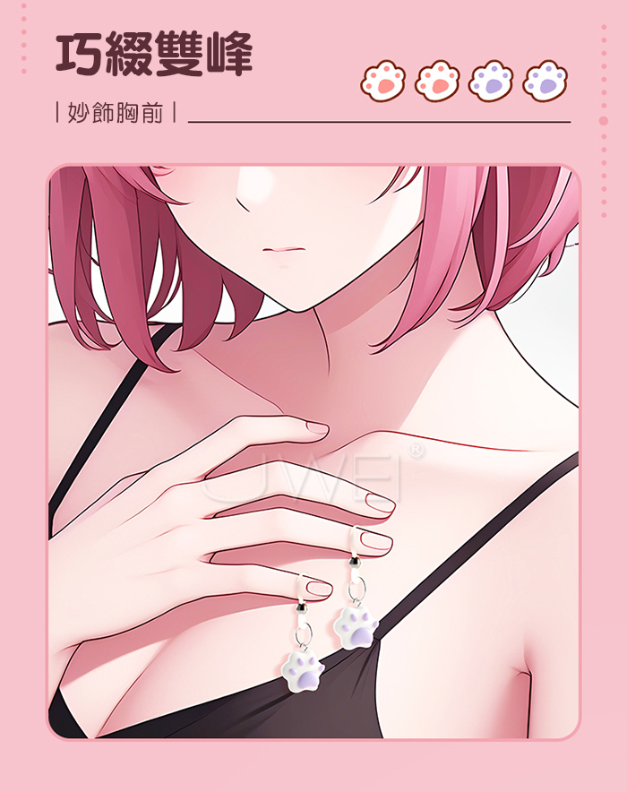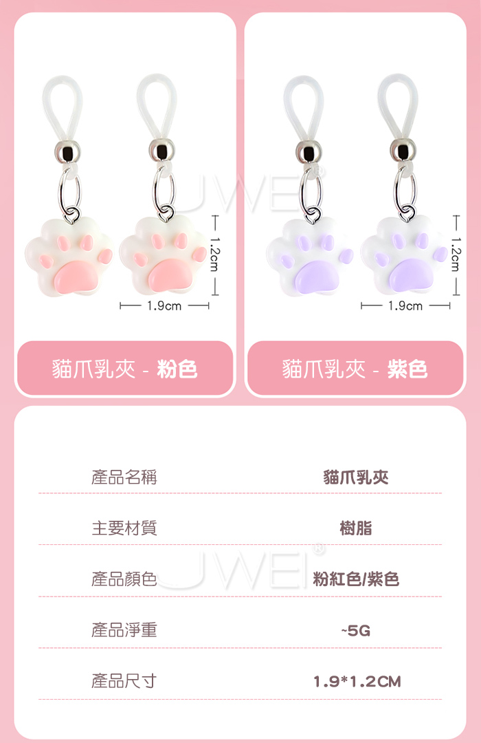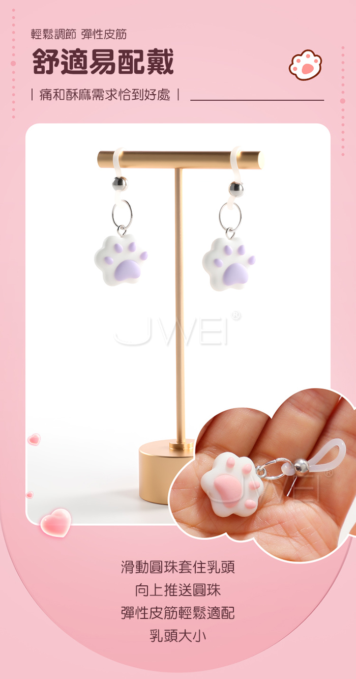 貓爪乳夾,皮筋乳夾低痛感,小巧精緻的同時不失美觀 感受更多溫柔 疼痛感較低 酥麻感強,不以疼痛感為目的,專為不戀痛人群及新手設計 外出佩戴 羞恥感加倍,隔衣出門 隱蔽穿戴,無論峰頭大小緊抱雙峰 ■尺寸:大小詳如圖片標示 ■材質:樹脂