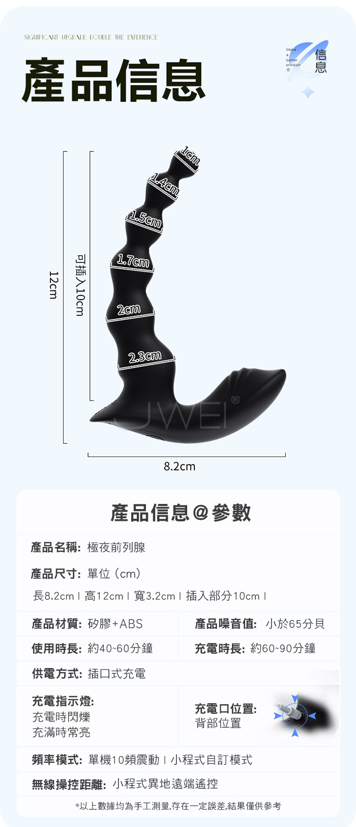 拉珠摩擦 無射快感!極夜前列腺,10頻穿透強震 層層遞進! 軟糯矽膠,舒適入體“柔軟不疼”外震蜜豆,挑逗咪咪 遠程控制,指尖把玩“距離不在是難題” 產品規格 ■材質: 矽膠+ABS ■規格: 詳如圖片標示 ■功能: 10頻震動、APP智控